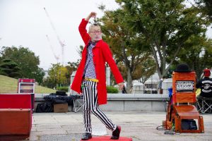 大道芸人歴は、2025年で25年になります。演目は、世界的名作をおとぼけB級サイレントコメディで演じています。